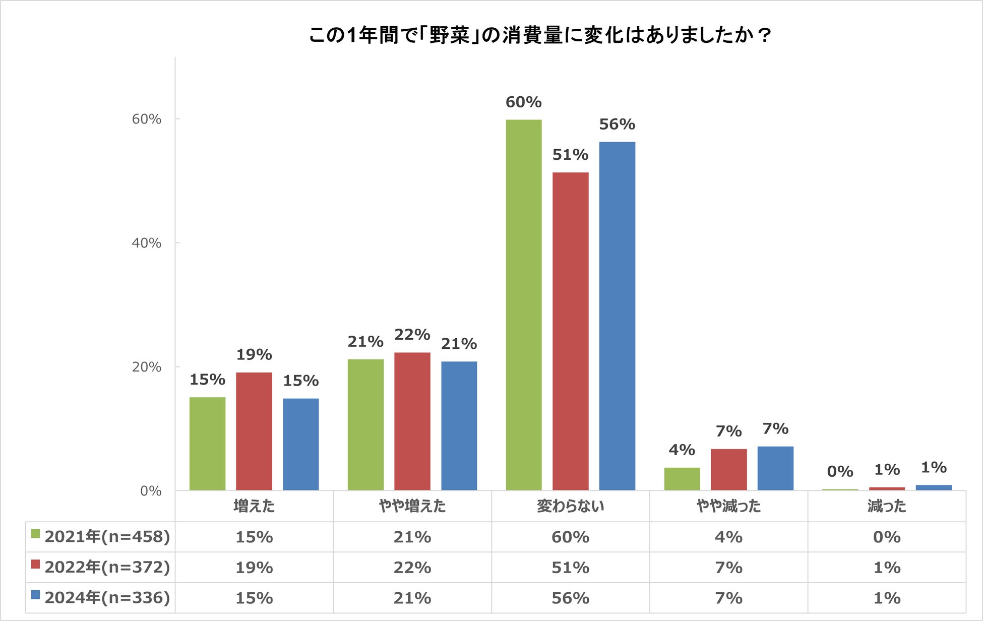 2021年からの調査で野菜の消費量については「変わらない」と回答する方が多い中、引き続き約4割は「増えた(増えた・やや増えた 合算値)」と回答しています。