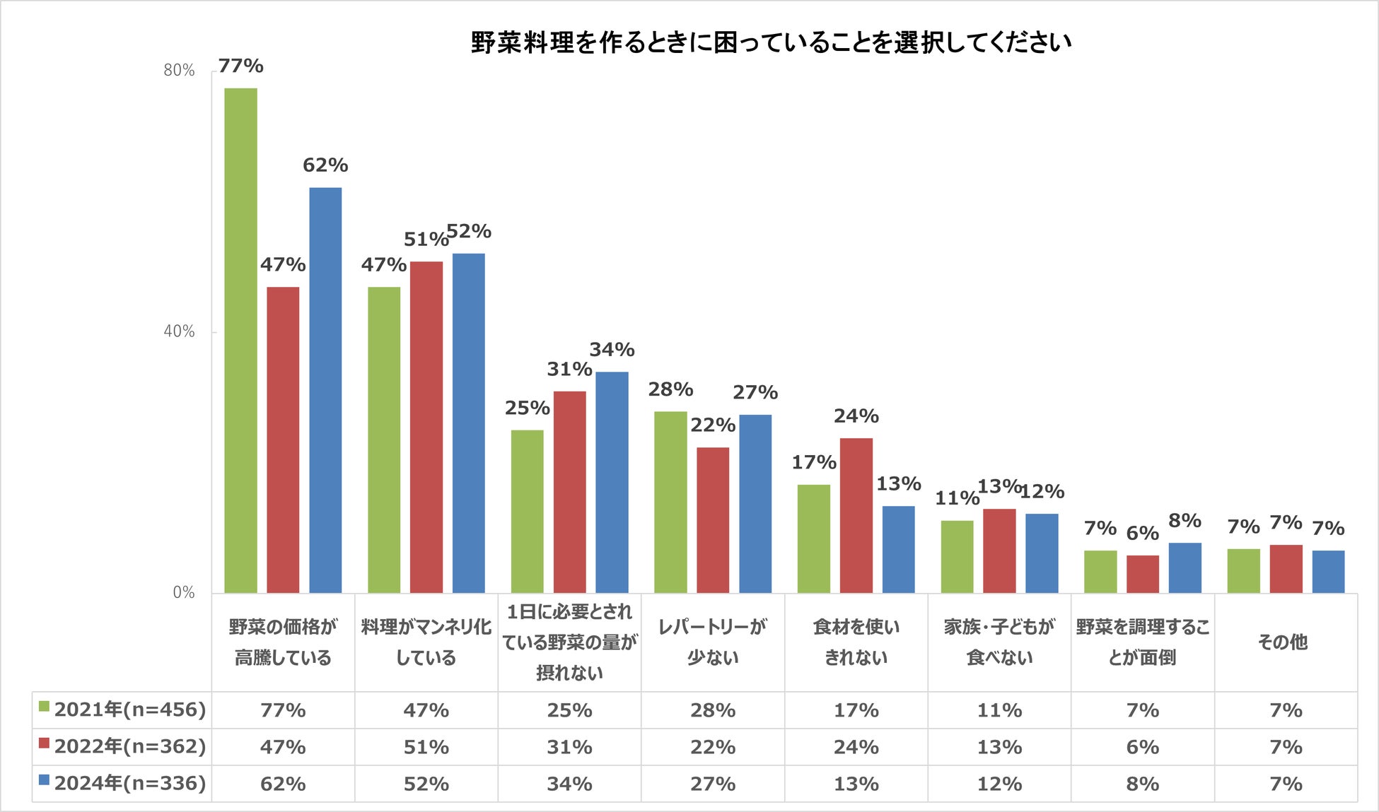野菜料理で困っていることについて「価格の高騰」に次いで、「料理のマンネリ化」「レパートリーが少ない」といった調理に関することが上位になっています。また、「1日に必要とされている野菜の量が摂れない」=摂取不足を感じている方も年々増えてきています。