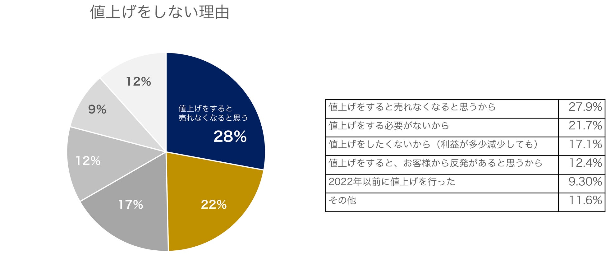 2023年以降に値上げを実施していない事業者は、「値上げをすると売れなくなると思うから(28%)」、「値上げをすると、お客様から反発があると思うから(12%)」を値上げしない理由として挙げており、値上げ後の消費者の反応を想像して値上げに踏み切れない様子もうかがえました。