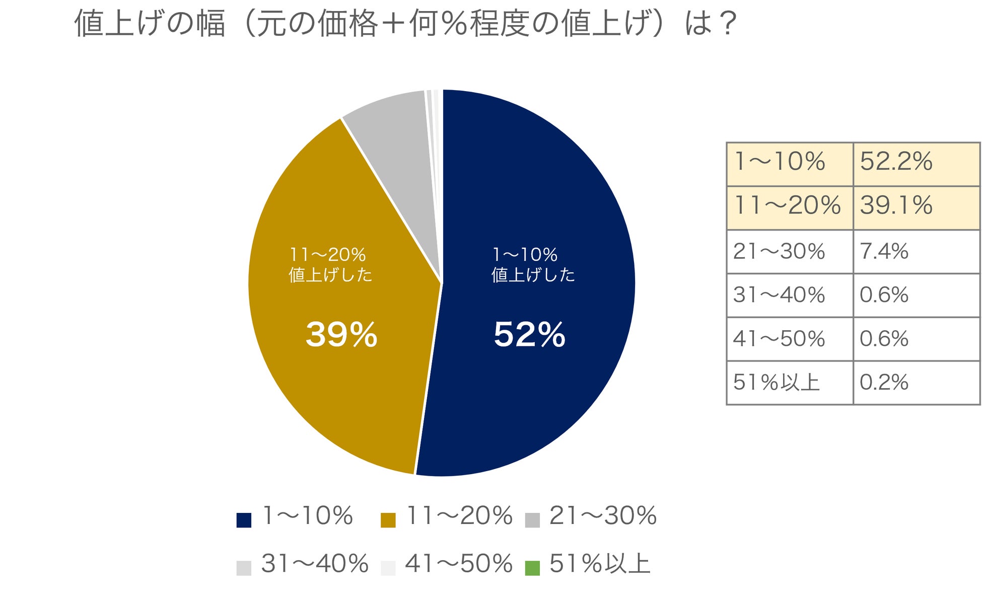 値上げを行った事業者のうち90%が、元の価格から20%以下の値上げを実施。そのうち、10%以下の値上げが半数以上を占めました。21%以上の値上げを実施した事業者は10%にも満たず、一定の値上げ幅に集中していることがわかりました。