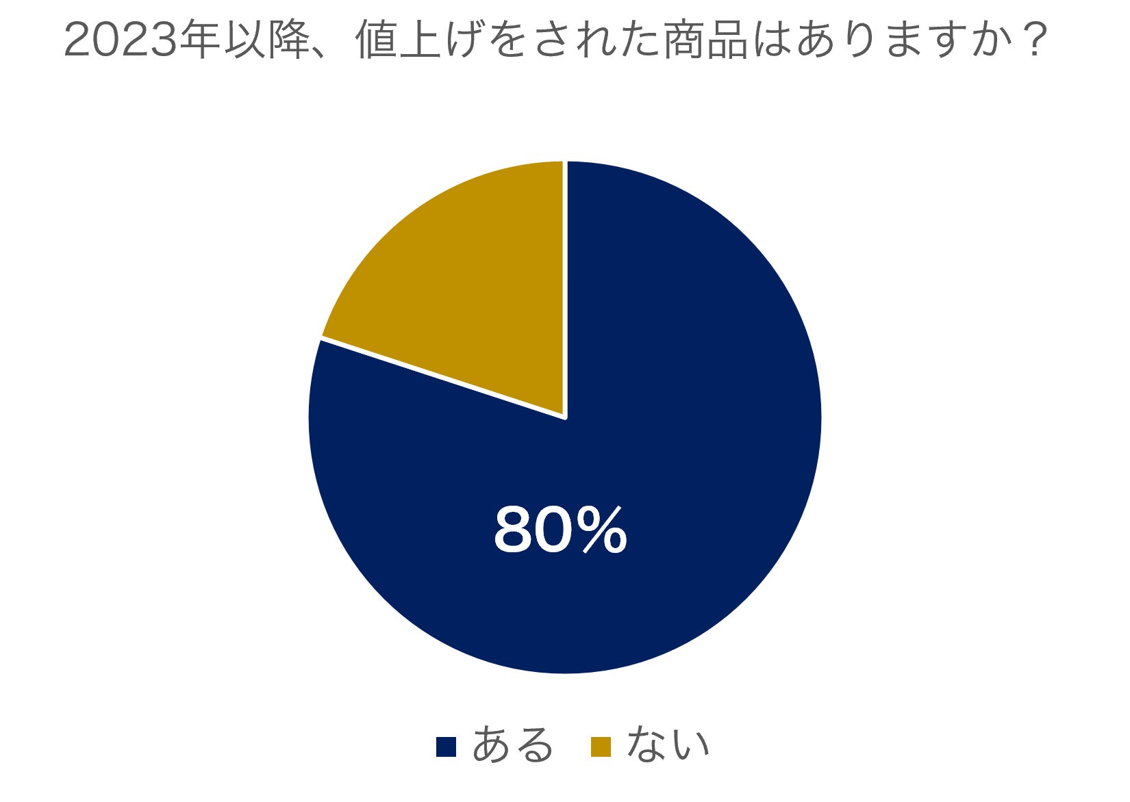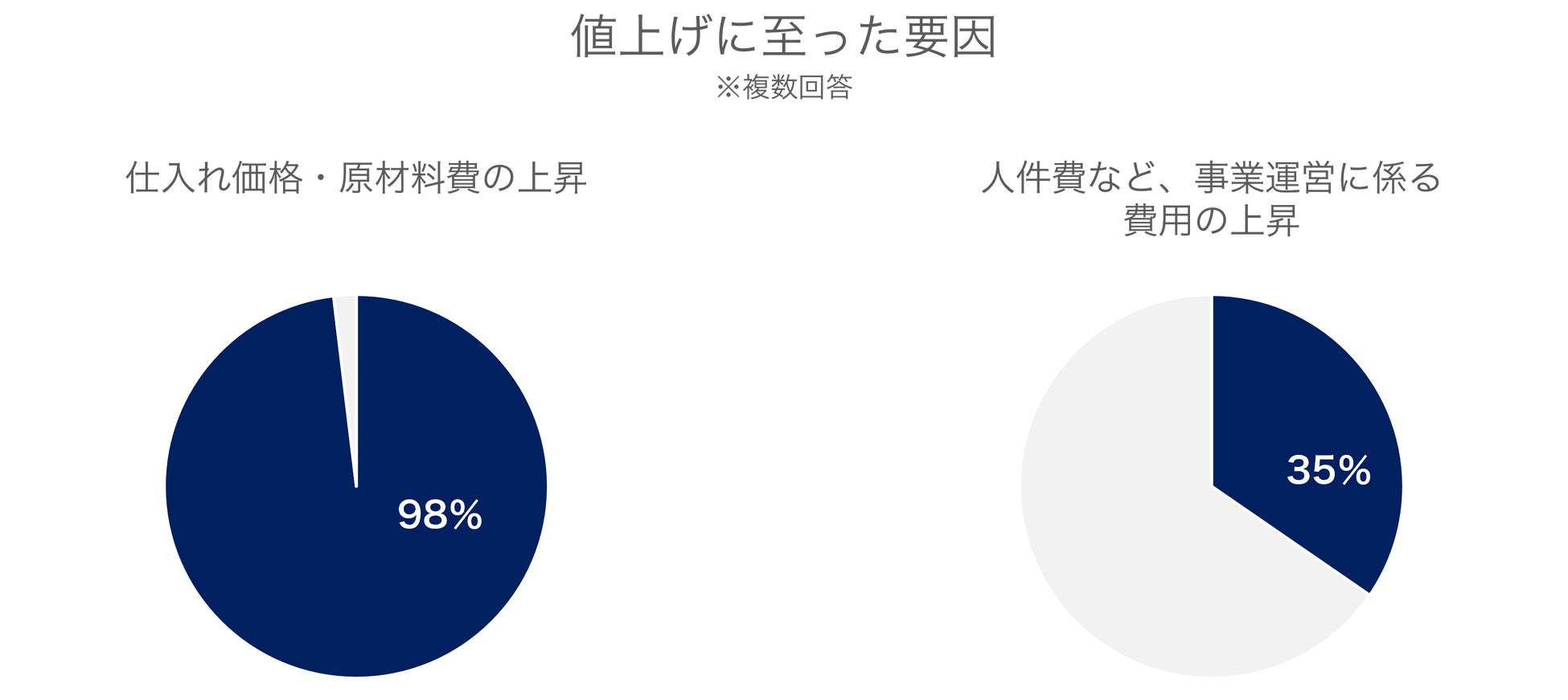 アンケートの結果から、80%の事業者が2023年以降に商品の値上げを実施していることがわかりました。理由としては「仕入れ価格・原材料費の高騰(98%)」、「人件費など、事業運営に係る費用の上昇(35%)」となっており、事業環境の変化に対応すべく価格転嫁が広がっていることうかがえます。