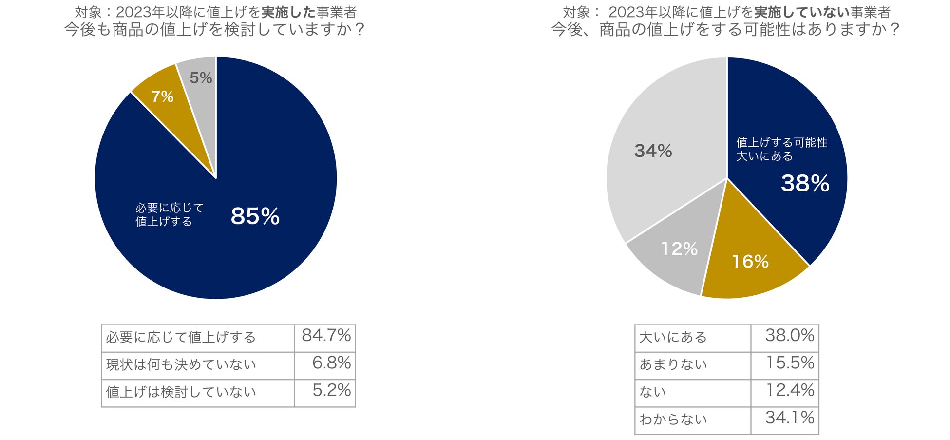 2023年以降に商品の値上げを実施している事業者、値上げを実施していない事業者双方に、今後の値上げについて聞きました。