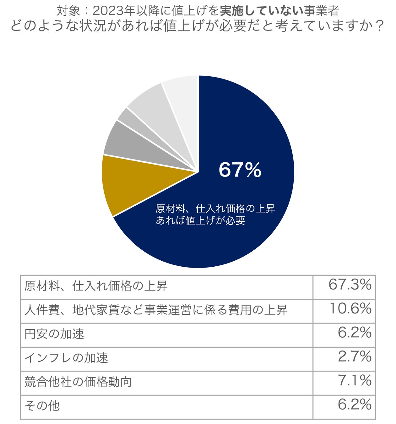 値上げを行わなかった事業者が、今後値上げが必要となるのは「仕入れ価格や原材料費の上昇」の影響が出た場合と67%が回答しており、値上げ実施に踏み切るトリガーとなるものは、すでに値上げを実施している事業者と同様という結果となりました。
