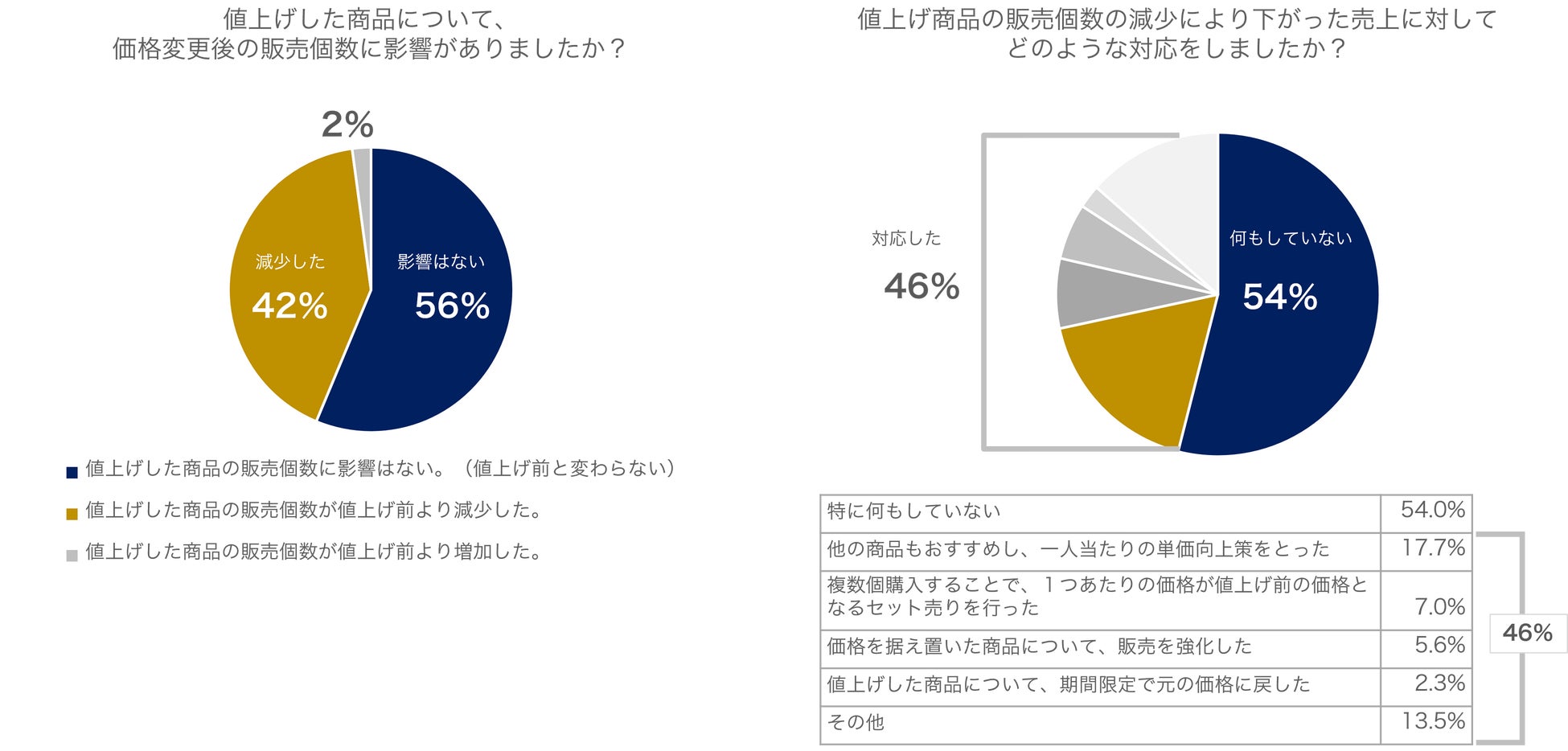 これまで長くデフレの時期があり、仕入れ価格や運営コストの上昇など、事業環境は厳しくなってきていると思われますが、消費者の反発や販売個数への影響を考えると値上げに踏み切れない事業者が少なからず存在するということがわかりました。実際に、値上げを実施した商品の販売個数が減少したという回答もありましたが、半数以上の事業者においては、値上げ前と変わらぬ販売個数を維持しています。