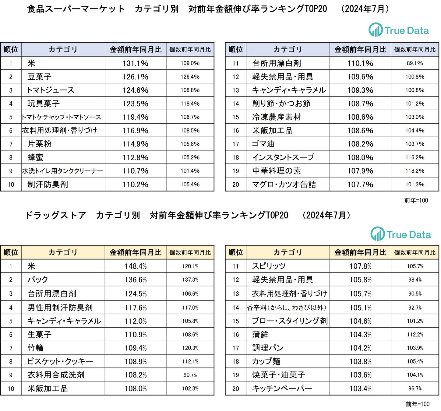 ビッグデータプラットフォームを運営する株式会社True Data(トゥルーデータ/本社:東京都港区、代表取締役社長:米倉 裕之、証券コード4416)は、当社の統計データをもとに、ドラッグストア、食品スーパーマーケットにおける2024年7月の売り上げ伸長カテゴリを発表します。「令和の米騒動」とも言われているほど品切れが話題になっている「米」は食品スーパーマーケットで売上金額が前年同月比31.1%増加、ドラッグストアで同48.4%増加しました。9月以降、スーパー店頭に本格的に並び始める新米は、例年以上に高い値段で販売される可能性があり、今後の消費動向が注目されます。