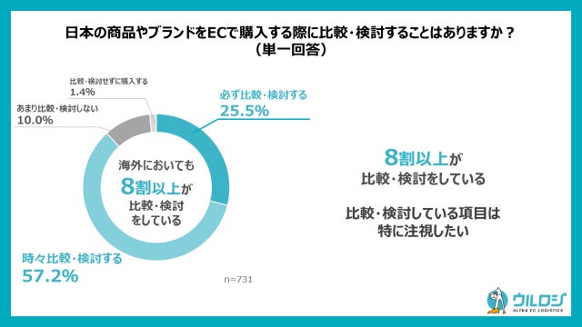 (単一回答)」と質問したところ、「必ず比較・検討する」が25.5%、「時々比較・検討する」が57.2%と8割以上の海外消費者が比較・検討していました。