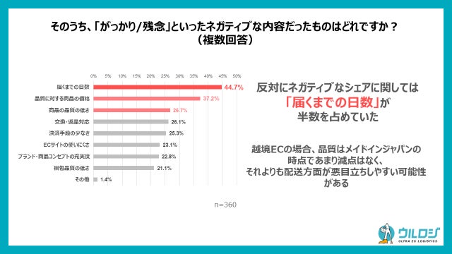 逆に、「そのうち、「がっかり/残念」といったネガティブな内容だったものはどれですか?(複数回答)」と質問したところ、1位が「届くまでの日数(44.7%)」、2位が「品質に対する商品の価格(37.2%)」、3位が「商品の品質の低さ(26.7%)」と約半数の人が越境ECの物流課題である配送時間に不満をこぼしていることがわかりました。