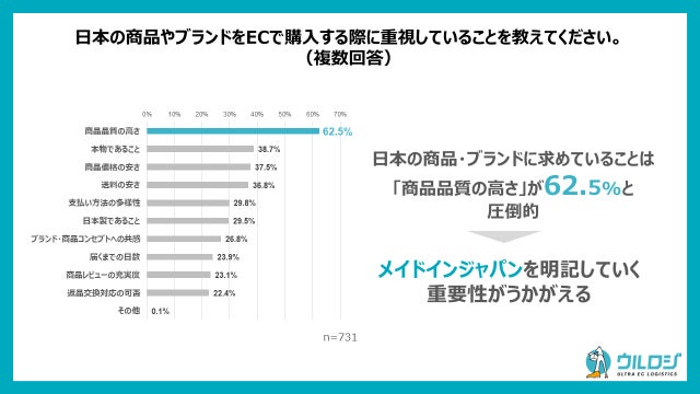 「日本の商品やブランドをECで購入する際に重視していることを教えてください。(複数回答)」と質問したところ、「商品品質の高さ」が62.5%とメイドインジャパンのブランド力が健在であることがわかりました。逆に言えば、品質がそこまでであれば買ってもらえないということです。日本商品としての質の担保も商品開発において重要な項目であることが伺えます。