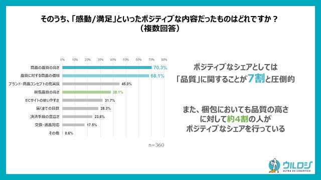 加えて、「梱包品質の高さ」に38.1%の人がポジティブなシェアをしていることがわかりました。日本の物流品質は世界でもかなり高いと言われており、その実態が伺えます。