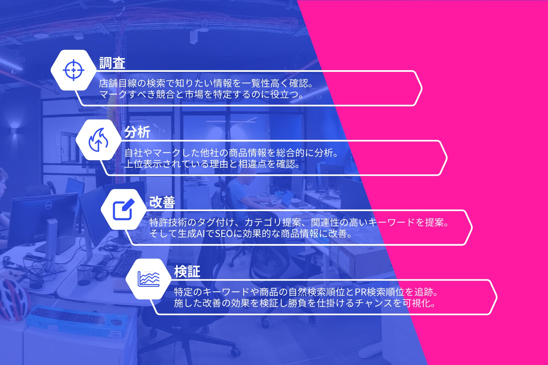 ユーザーの声から生まれたAIタッガーの新機能は、自社でSEO対策を行う手間や専門知識不足の課題を解決するために設計されました。商品名やキャッチコピー、カテゴリ、タグなどの重要な検索対象項目を総合的に最適化し、商品情報の質を向上させます。また、重要なキーワードの特定や自社および競合商品の検索順位の追跡を通じて、出店者が効果的なSEO対策を実現できるようサポートします。