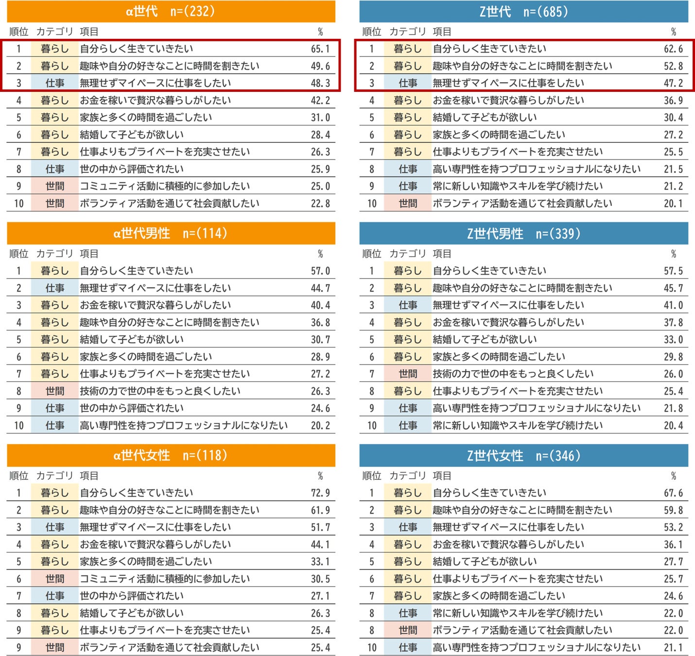 世代間の差はあまり見られず、TOP3は「自分らしく生きていきたい」「趣味や自分の好きなことに時間を割きたい」「無理せずマイペースに仕事をしたい」と自分を大切にしてマイペースにいきたいという気持ちが強く見られました。