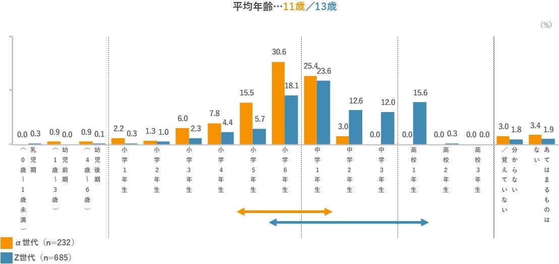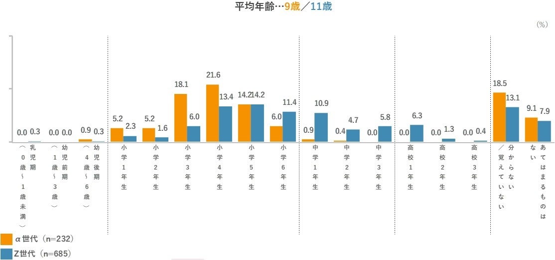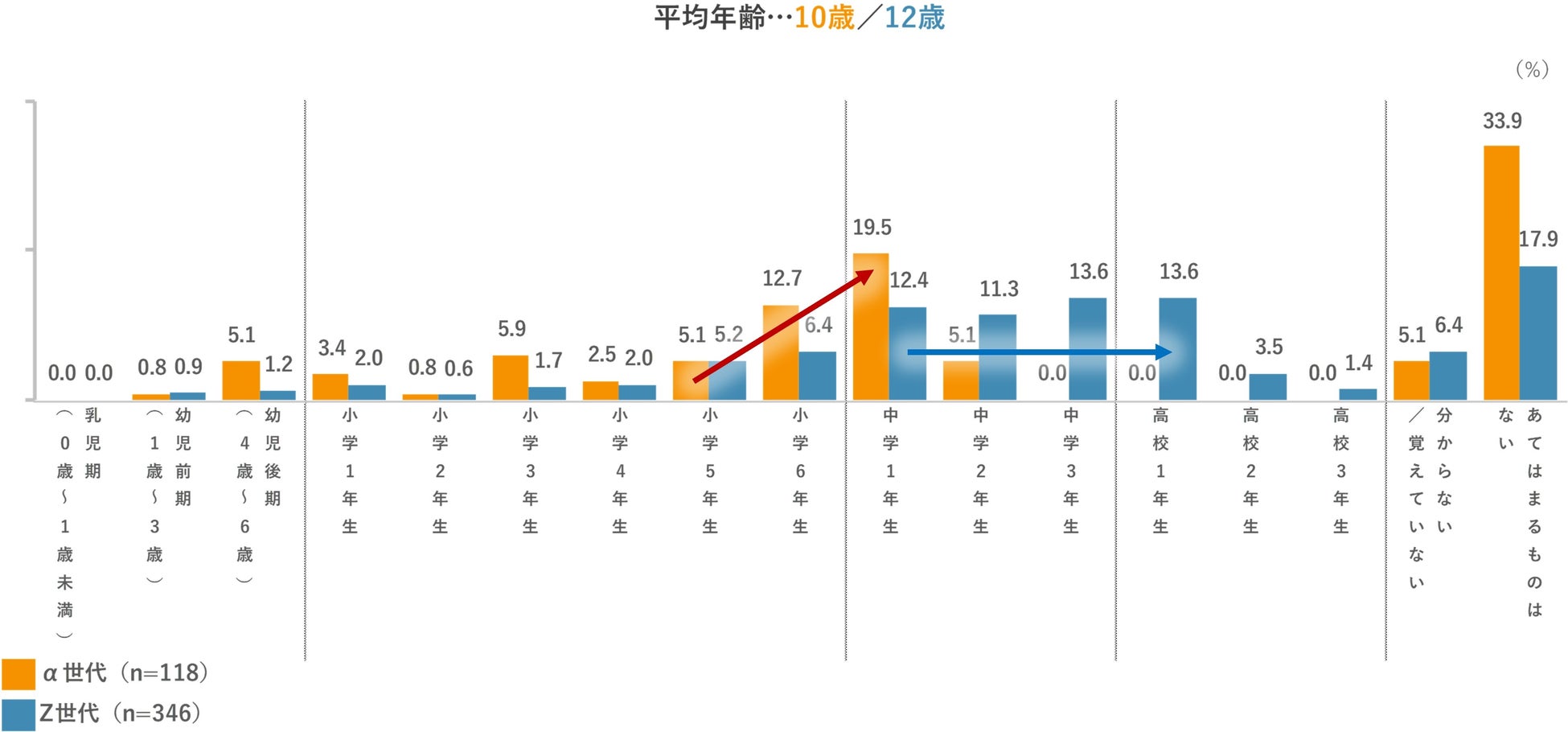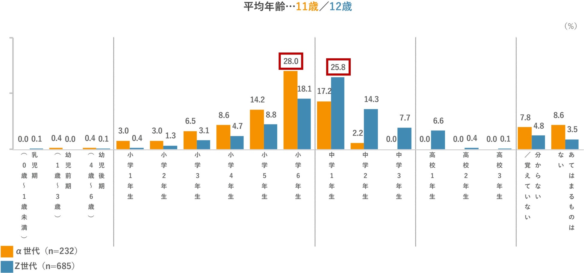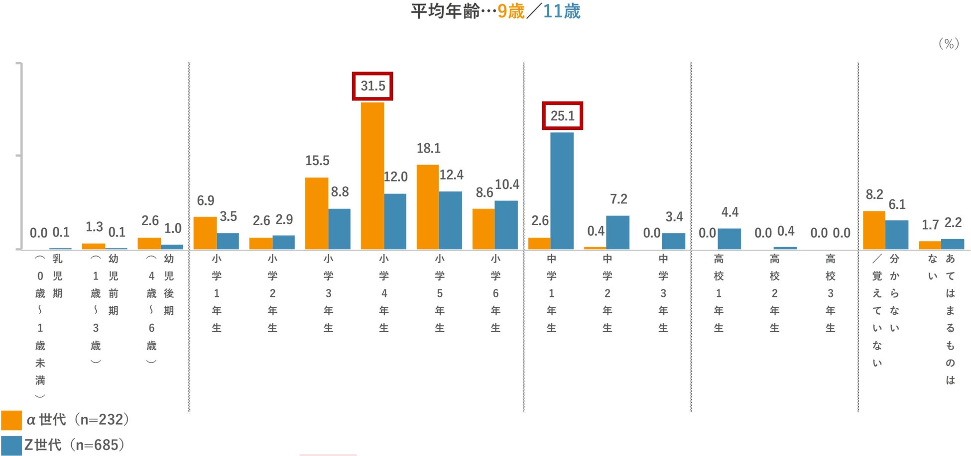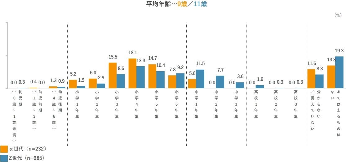 α世代とZ世代の差を確認するにあたり、「はじめて○○したのはいつ?」という質問をいくつか聞いてみました。初めてスマホを買ってもらった時期を確認したところ、Z世代は小学6年生~高校1年生がボリュームゾーンだったのに対し、α世代は小学5年生~中学1年生となっています。α世代は中学生になるまでに65.2%がスマホを持っていることになり、より幼いうちから自分の所有物としてスマホを所有していることが分かります。