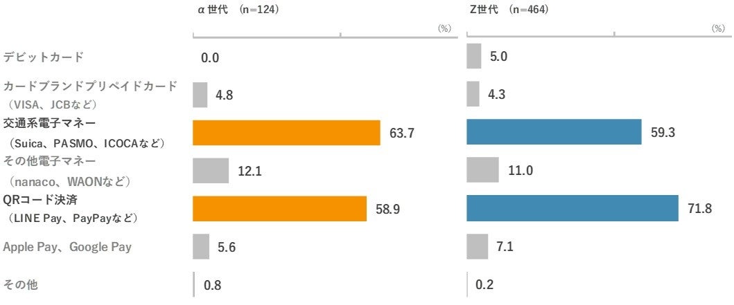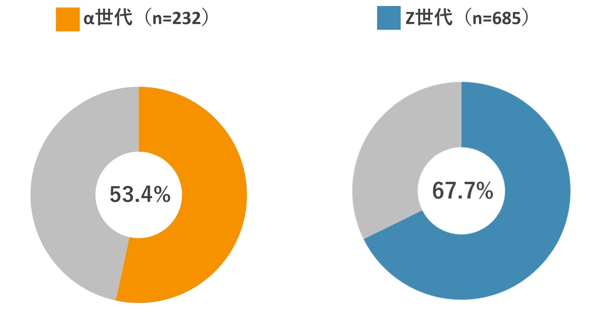 α世代は5割、Z世代は7割がキャッシュレス決済を利用しているという結果になり、いずれの世代もキャッシュレス化が進んでいる様子が見られました。