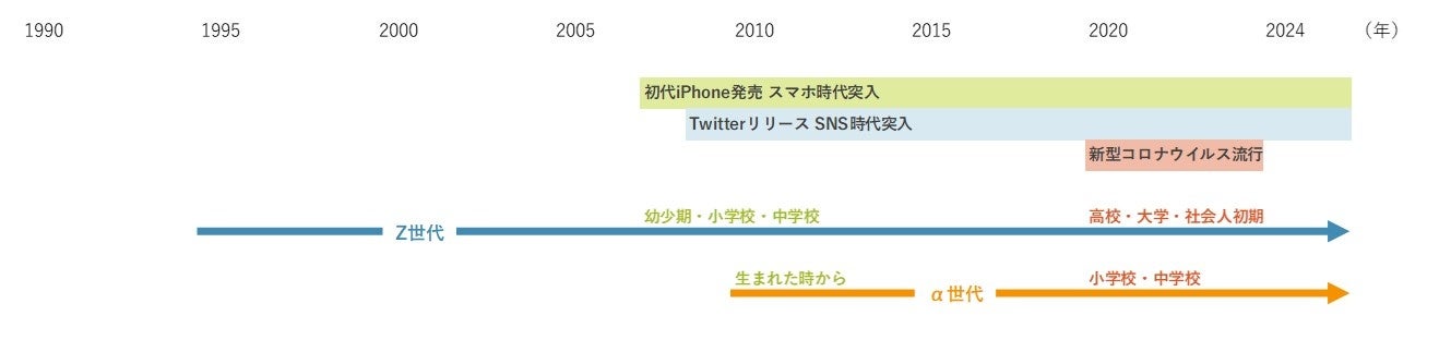 α世代は2010年~2024年頃に生まれ、生まれた時からスマホやSNSが当たり前にある環境で育ち、Z世代よりもさらにデジタルネイティブと言われています。小学校・中学校でコロナ禍を経験しました。