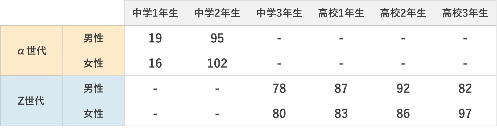 今回の調査では現在の中学1年生~中学2年生(13歳~14歳)をα世代、中学3年生~高校3年生(14歳~18歳)をZ世代と区分し、それぞれの特徴を捉えるべく考察しました。