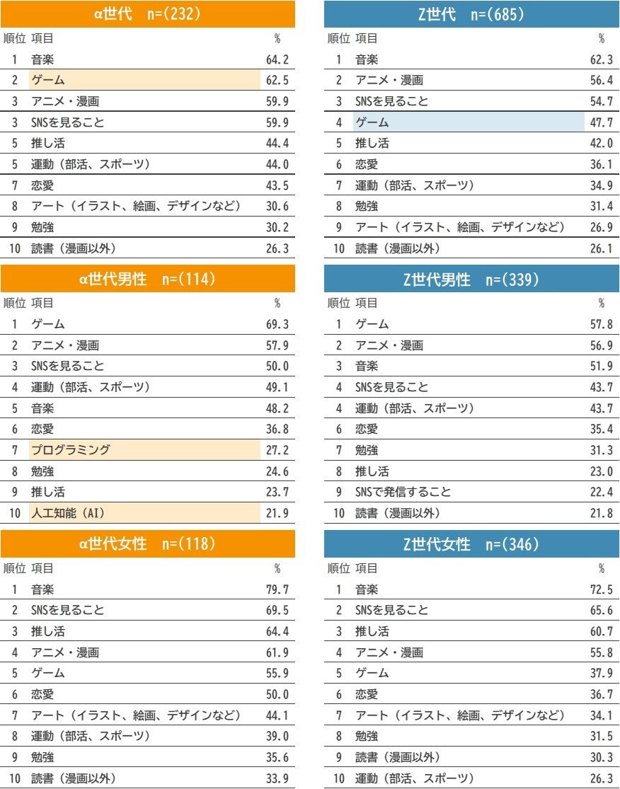 上位項目はおおよそ同じ傾向にありますが、「ゲーム」はZ世代が4位なのに対しα世代では2位となりました。