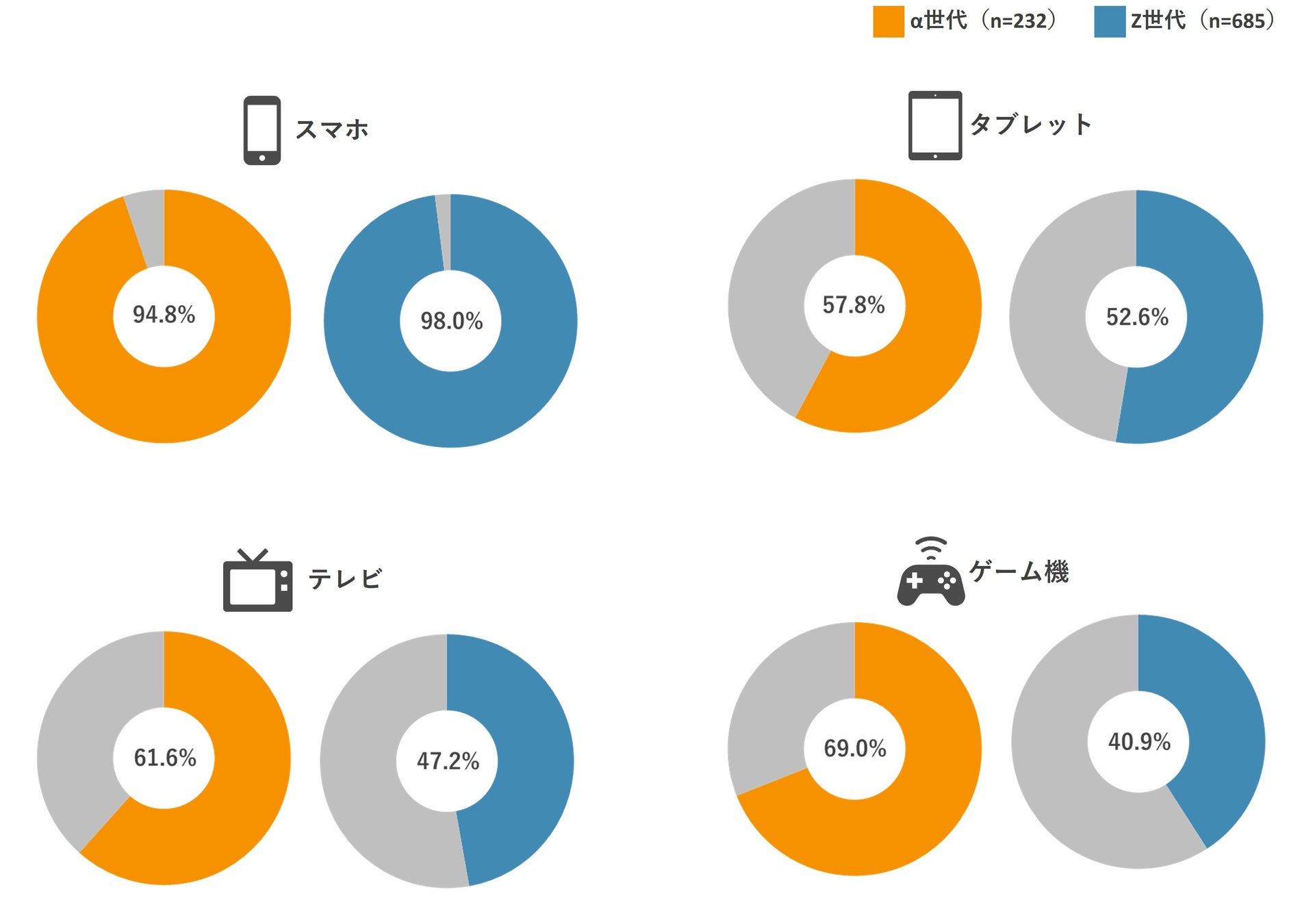 世代間で最も差が出たのがゲーム機です。Z世代が4割に対してα世代では7割にのぼります。放課後は、友達とそれぞれの自宅からオンラインゲーム上で集合して一緒に遊ぶ、といったコロナ禍で定着したことが、現在も日常的に行われているのかもしれません。