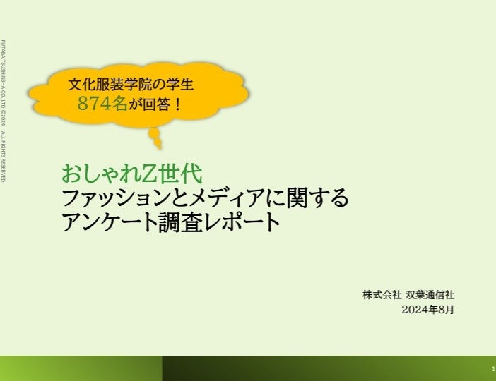 株式会社双葉通信社(以下 双葉通信社 / 本社:東京都中央区、代表取締役:小西聡)は、今年で4回目となる文化服装学院とのコラボレーションによるアンケート調査を実施。回答した学生874名の79%が18~21歳という、ファッションが好きなおしゃれZ世代の学生たちを対象とするアンケートを通じて、彼らのインサイトを探った調査結果を発表いたします。