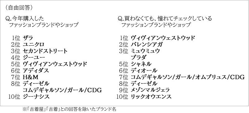 「今年購入したファッションブランドやショップ」「買わなくても、憧れてチェックしているファッションブランドやショップ」を自由回答で聞きました。