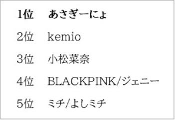 「kemio」「BLACKPINK/ジェニー」も上位に。