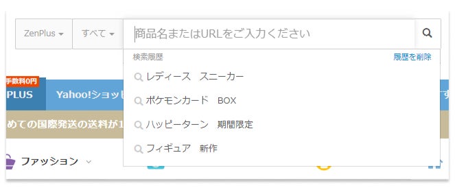 過去に検索したキーワードが検索バーに履歴として表示され、再検索やストア間での検索結果の比較が容易になりました。ログイン時には、「履歴を削除」ボタンで一括削除することも可能です。