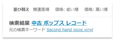 検索結果画面には、元の外国語キーワードと変換後の日本語キーワードが両方表示されます。誤訳があった場合でも、ワンクリックで元の検索フレーズを使用して再度商品検索が可能です。