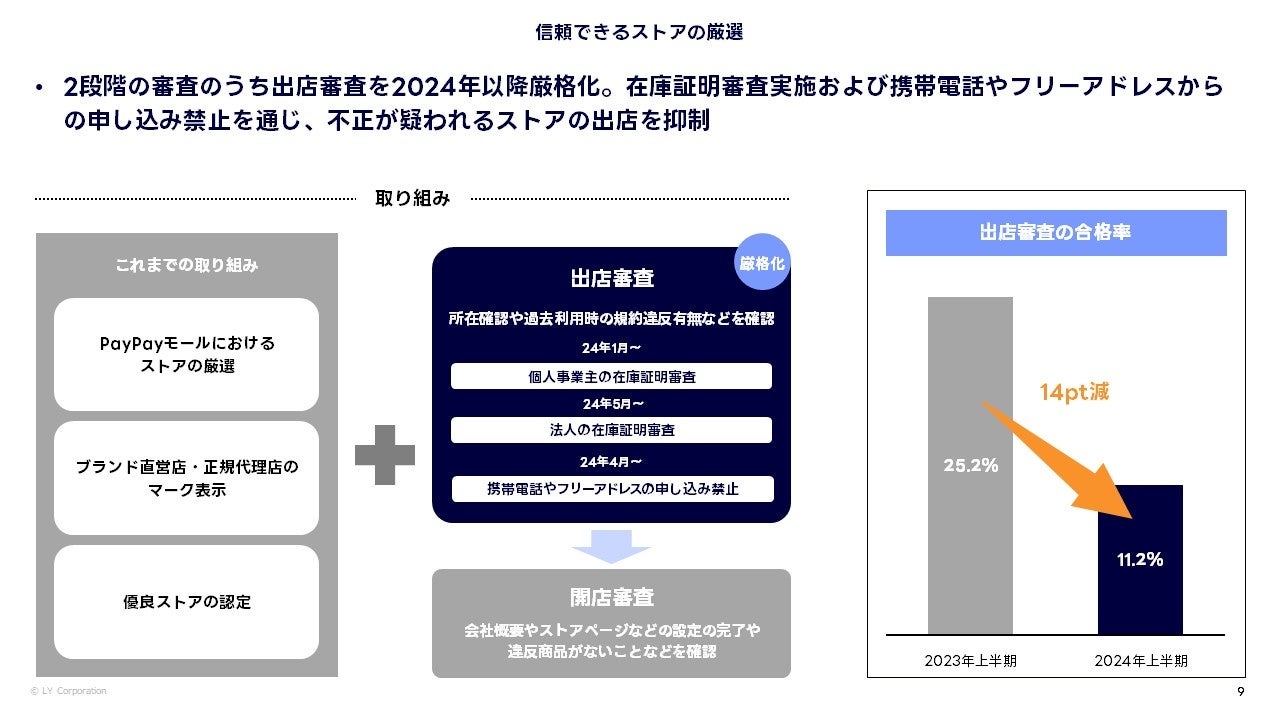 こうした取り組みに加え、2024年1月には出店段階の審査をさらに強化するため、適切な運営かを確認する「在庫証明審査(※3)」を実施し 、2024年4月以降には携帯電話やフリーメールアドレスを利用した出店の申し込みを禁止しました。この結果、2024年上半期における出店時の審査合格率は2023年上半期の25.2%から14.0pt減の11.2%となり、不正が疑われるストアの出店を抑制しています。