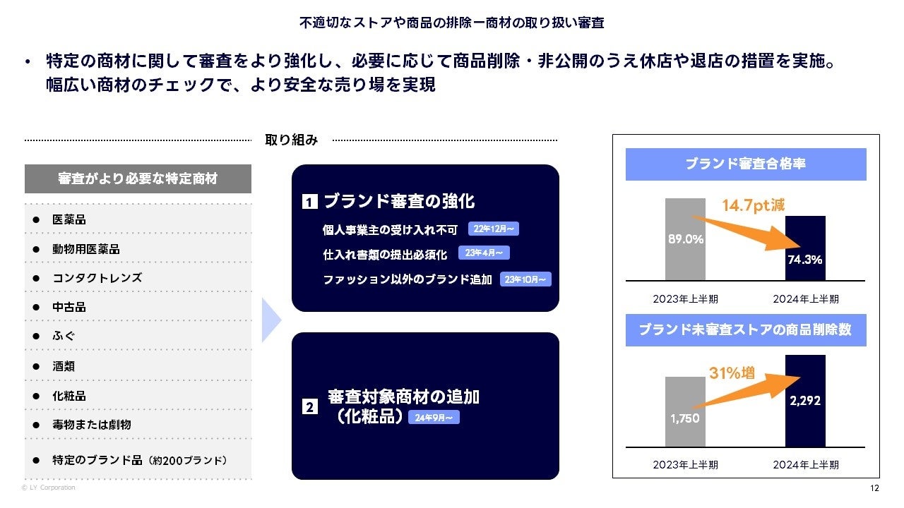 また、商材の取り扱い審査では、対象とする商材およびブランドの拡大や仕入れ書類の提出必須化などを通じて、審査を強化し、2024年上半期のブランド審査の合格率は、2023年上半期の89.0%から14.7pt減の74.3%に減少しました。また、2024年上半期のブランド未審査ストアの商品削除数も2023年上半期の1,750件から31.0%増の2,292件となりました。