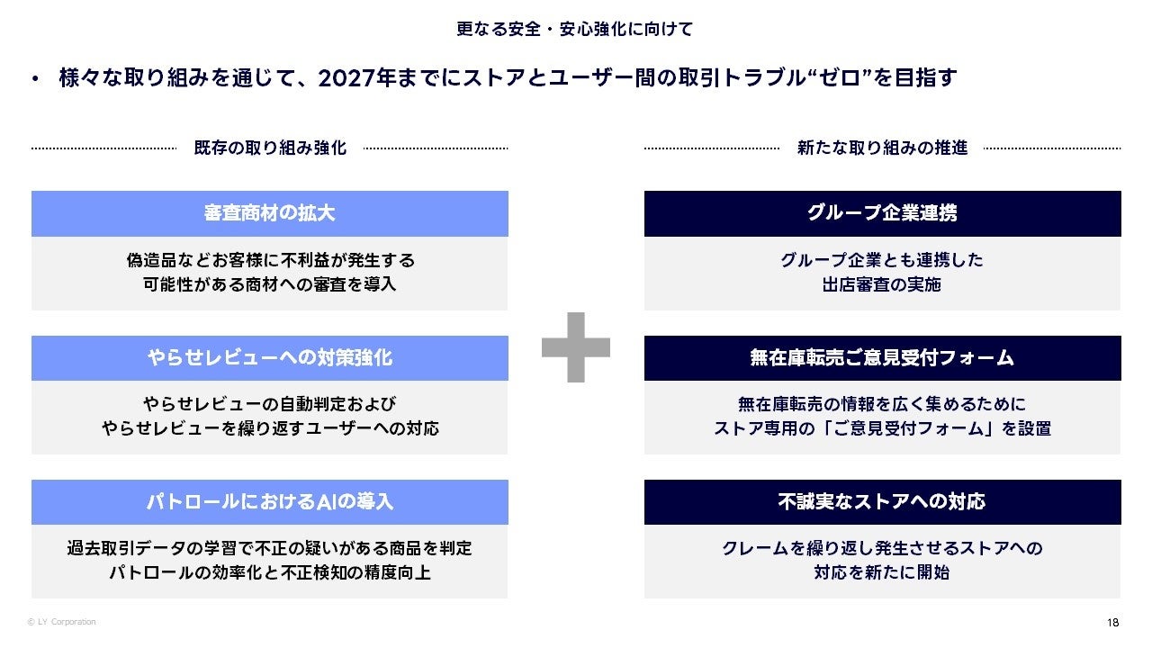 今後、既に実施している「審査商材の拡大」「やらせレビューへの対策」「パトロールにおけるAIの導入」をさらに強化していく予定です。また、新たな取り組みとして、「LINEヤフーグループ内での連携強化」「無在庫転売ご意見受付フォームの開設」「クレームを繰り返し発生させるストアへのペナルティ強化 」などを行っていきます。