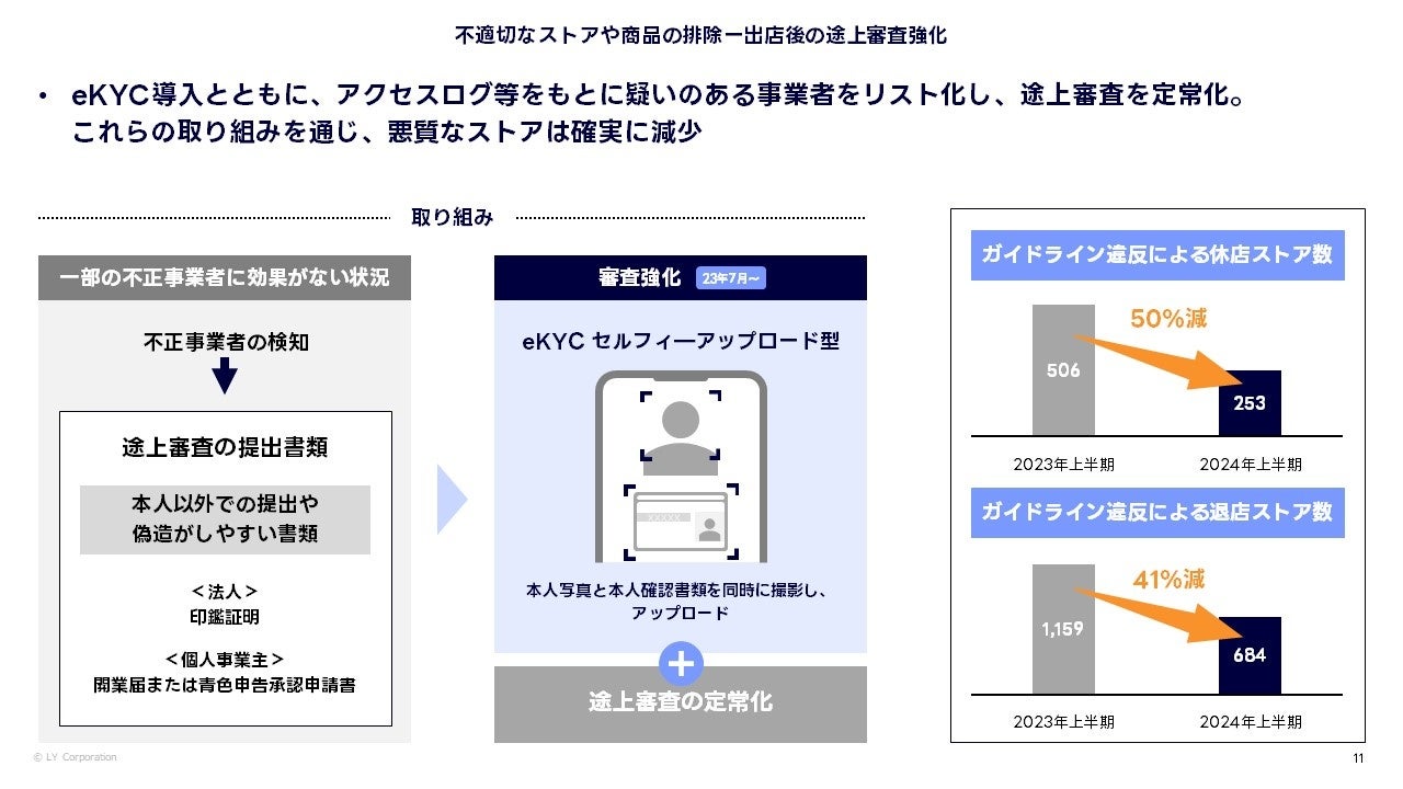 出店後の取り締まりも強化し、2023年7月からは、出店者の本人確認のためeKYC(※4)を導入し、アクセスログなどをもとに不正が疑われるストアをリスト化し、途上審査を定常的に実施しています。パトロールにより、2024年上半期の休店ストア数は、2023年上半期の506ストアから50.0%減 の253ストアになりました。2024年上半期の退店ストアも、2023年上半期の1,159ストアから41.0%減の684ストアとなり、売り場における悪質なストアは減少しています。