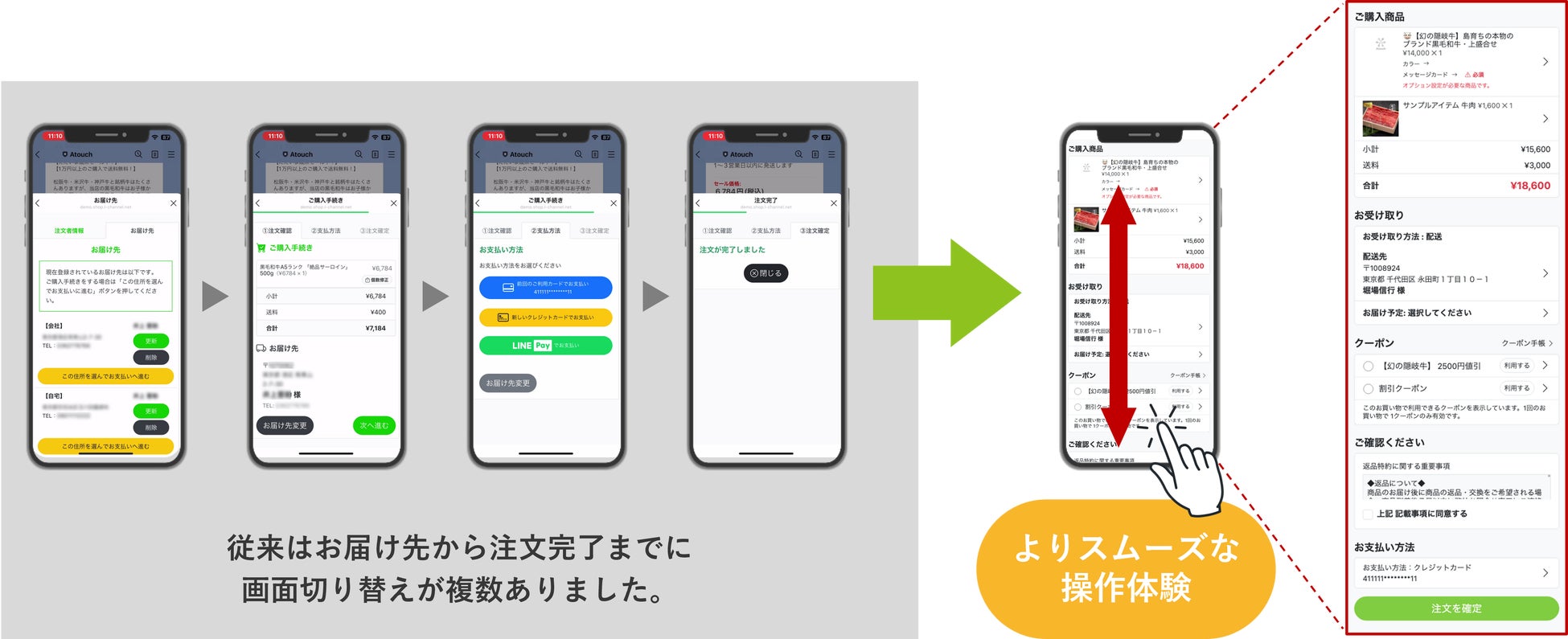 これにより「Atouch」の購入画面の導線が従来より簡略化され、今まで数ステップ必要だった購入画面までの遷移を大幅に削減、ワンステップで購入できるようになりました。