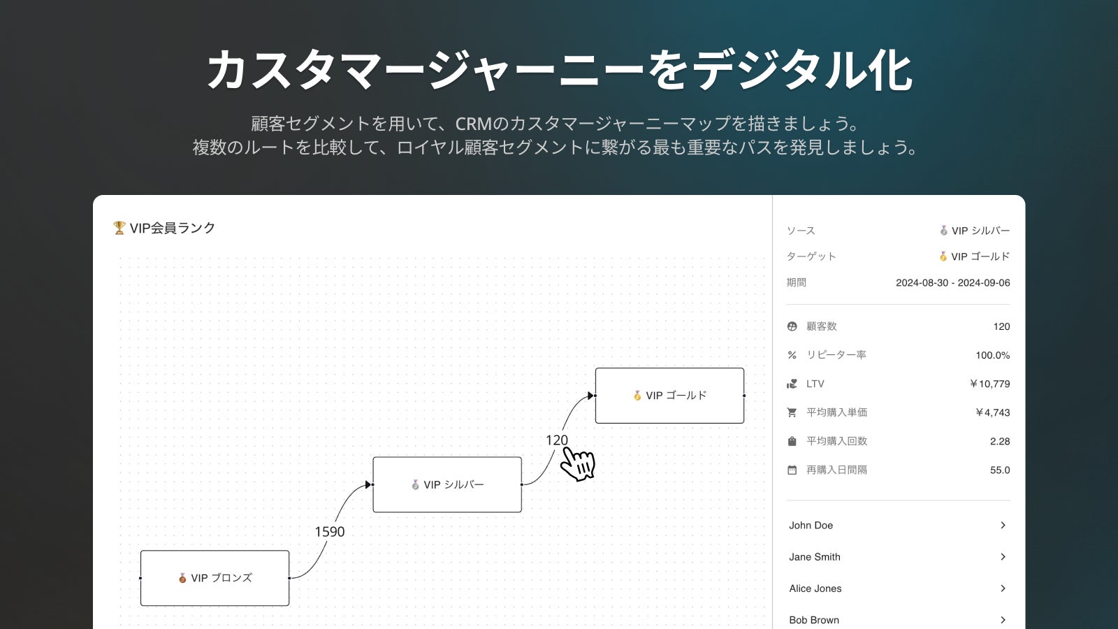 カスタマージャーニーは、顧客セグメントを利用してオンラインストアCRMの全体像を直感的に管理することができるECPower独自の機能で、2024年1月よりユーザーの協力を得ながら開発を進めてまいりました。「ロイヤル顧客セグメント」に繋がる複数のルートを比較して最も重要なパスを発見する、会員プログラムにおけるランク間の顧客の移動を確認する、オンラインストアや実店舗の間の顧客の移動を可視化するといった用途で活用することができます。