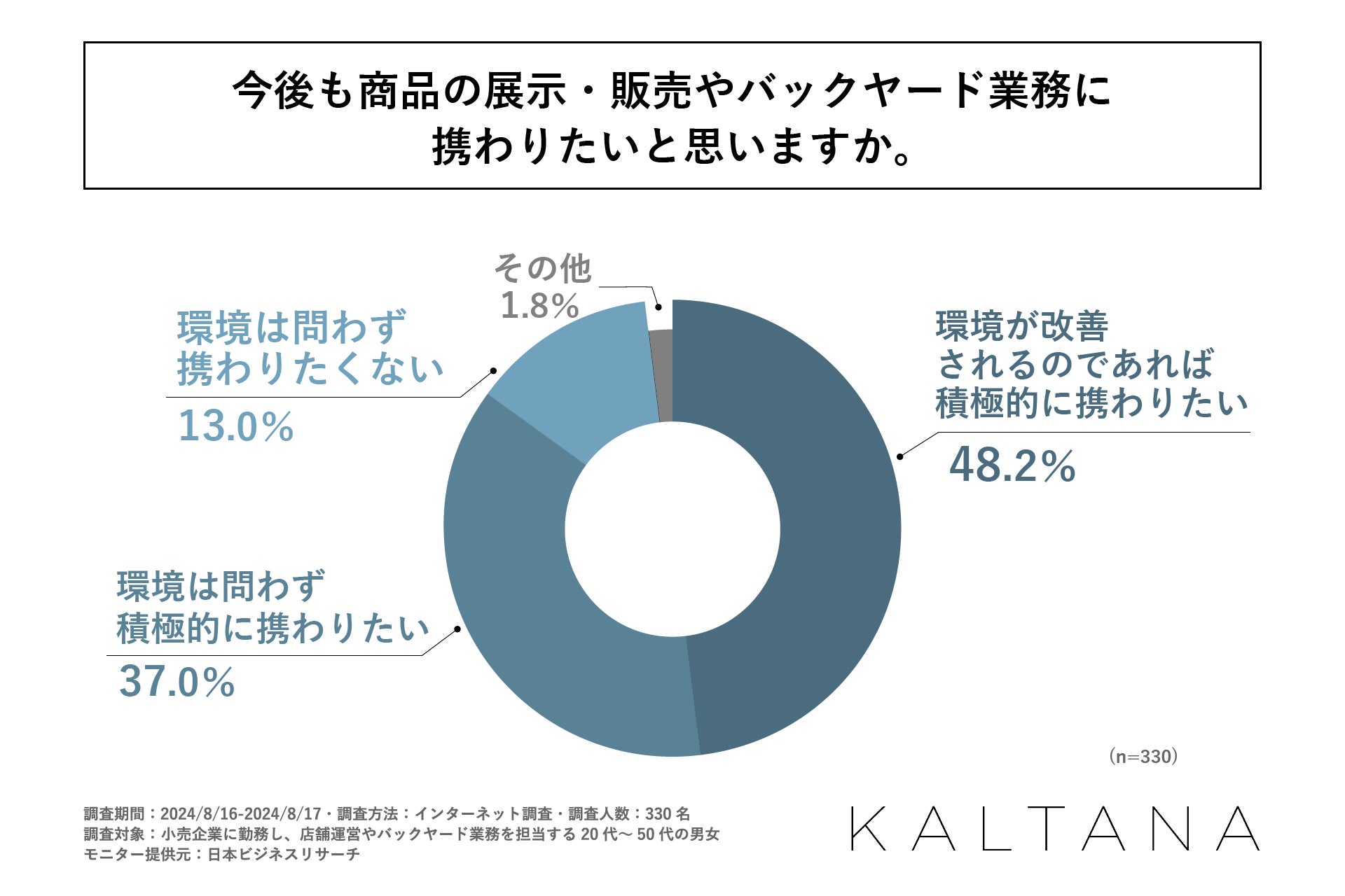 調査の最後に「今後も商品の展示・販売やバックヤード業務に携わりたいと思うか」を問う設問の回答では、1位が「環境が改善されるのであれば積極的に携わりたい」で48.2%、2位が「環境は問わず積極的に携わりたい」で37.0%となりました。総じて商品展示・販売やバックヤード業務を前向きにとらえている方が多いとわかりました。一方で、約半数の方は、本業務を続ける上で、労働環境の改善を求めている、という事実が明らかになりました。