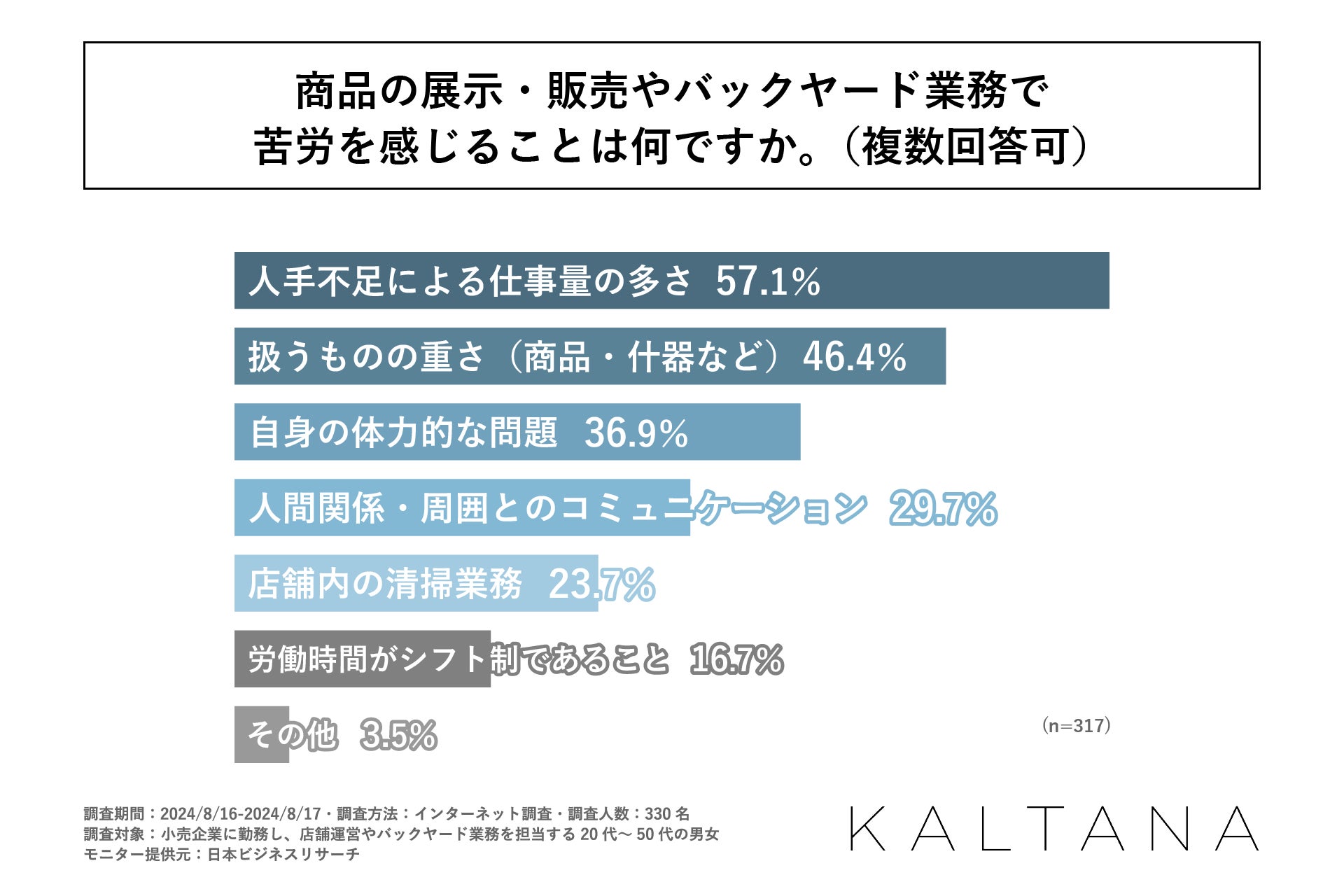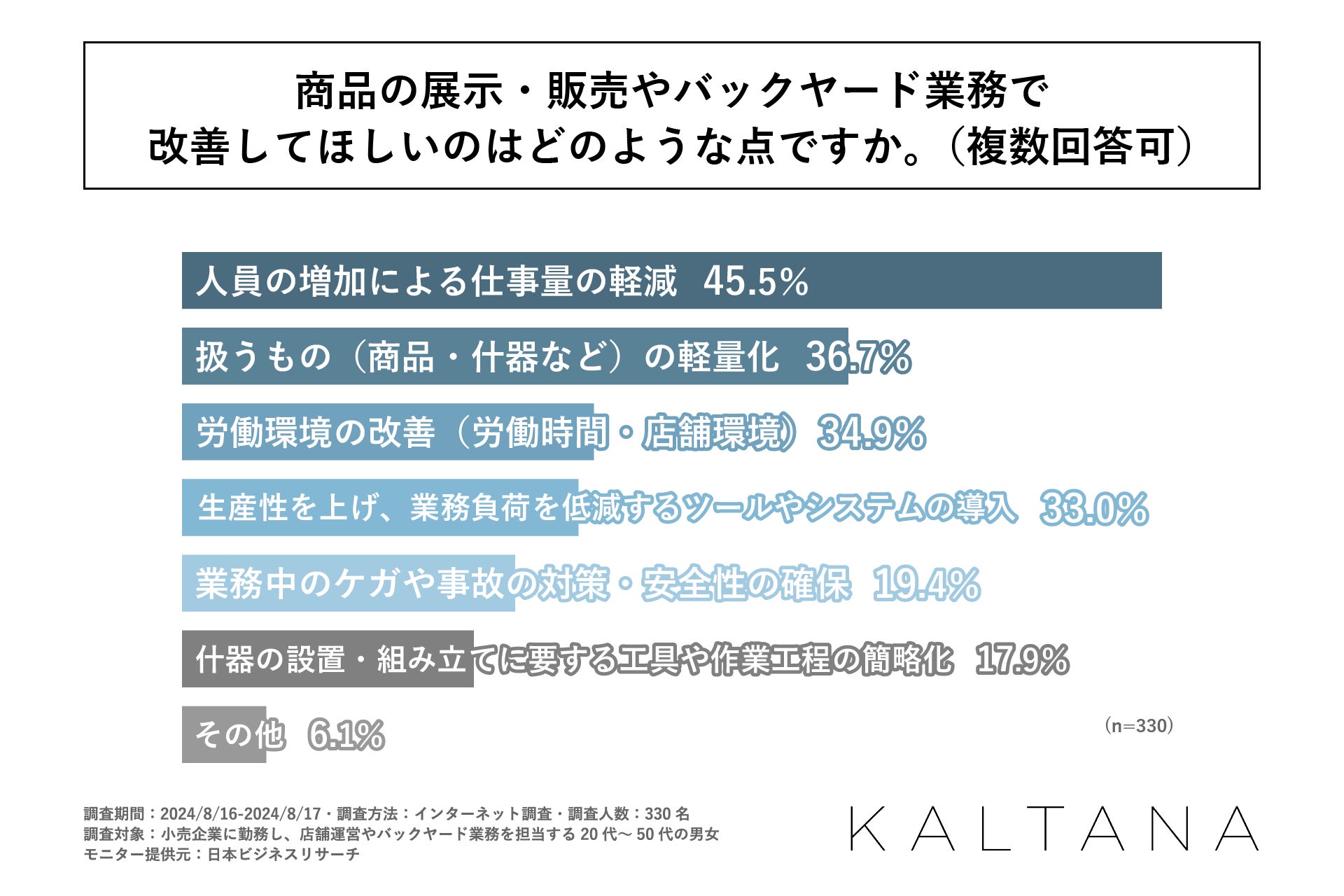 コロナ禍を経て、ECやD to C(Direct to Consumer)は活況を呈しています。一方で、商品を消費者へ直接商品を販売する店頭販売も活気を取り戻しつつあり、商業施設などには多くの顧客が来店しています。小売の店頭では商品の展示・販売やバックヤードでの在庫管理など常に物品を移動させる業務が発生します。こうした業務は特にシニア層や女性には業務負荷が高い作業となります。働き方改革が叫ばれる昨今、人が稼働するこうした業務に関しても生産性の向上が求められています。また、業務負荷の高い仕事は一般的に嫌われる傾向にあり、離職にもつながり得ます。そこで、軽さと堅牢性を備えたアルミ製棚台車『KALTANA(カルタナ)』の製造・販売を行う岩谷マテリアルは、小売業界で店舗運営やバックヤード業務に従事されている20代~50代の会社員の方を対象に、「小売業界の店舗運営・バックヤード業務における仕事の変化」に関する調査を行いました。