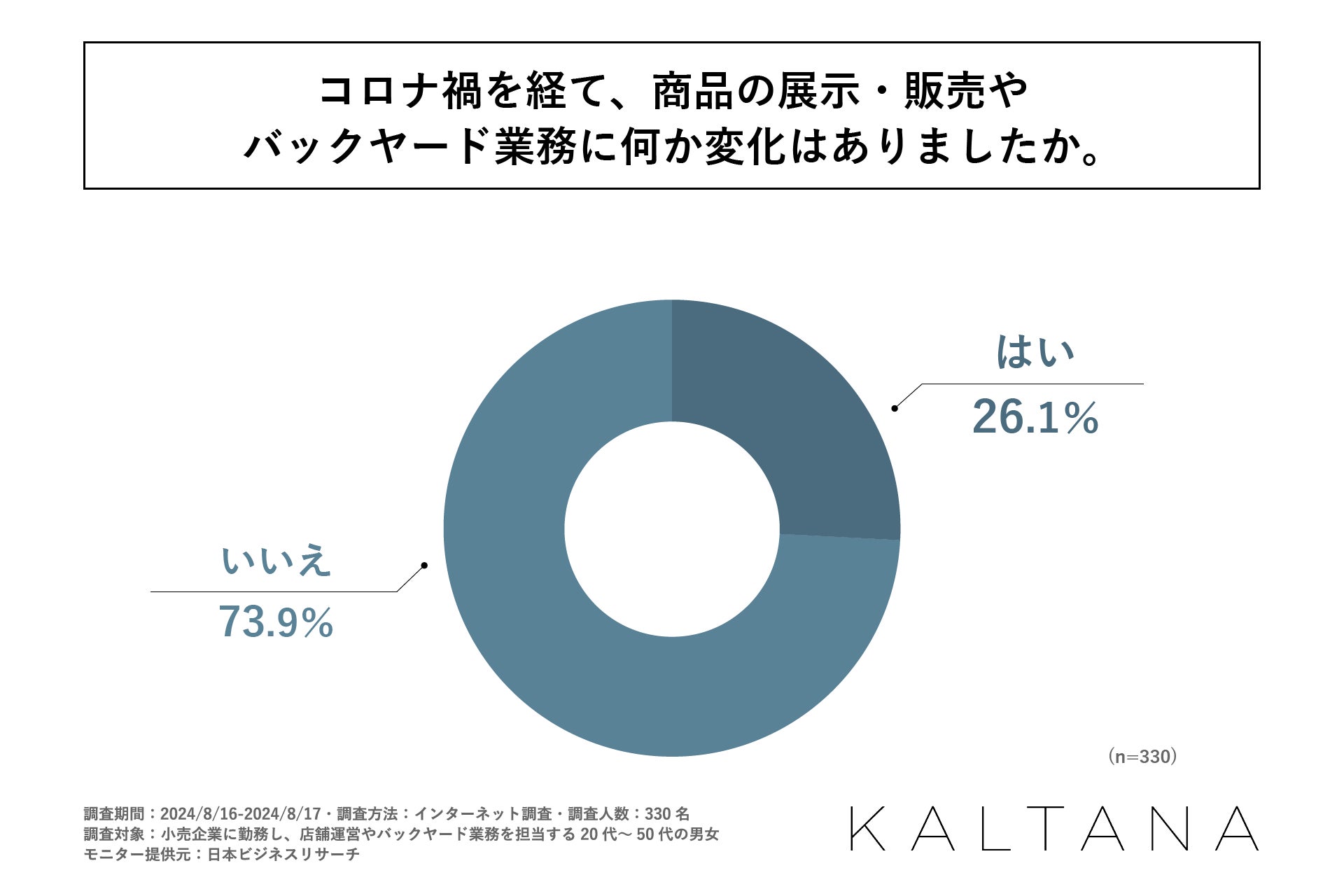 続いて「コロナ禍を経て、商品の展示・販売やバックヤード業務に何か変化はあったか」を問う設問への回答では、「いいえ」が73.9%と過半数を占める形となりました。「はい」と回答された方は26.1%と、商品の展示・販売やバックヤード業務に何らかの変化を感じている方は4人に1人程度であることが、この結果からわかりました。