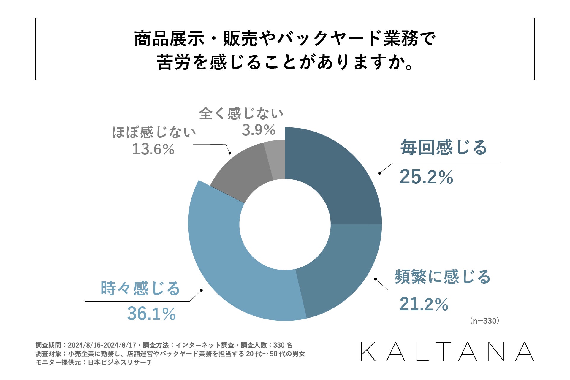 まず、「商品展示・販売やバックヤード業務で苦労を感じることがあるか」を尋ねる設問への回答では、1位が「時々感じる」で36.1%、2位が「毎回感じる」で25.2%、3位が「頻繁に感じる」で21.2%という結果になりました。「ほぼ感じない(13.6%)」と「全く感じない(3.9%)」と回答された方の合計は17.5%に留まり、大半の方が商品展示・販売やバックヤード業務で何らかの苦労を感じていることが明らかになりました。