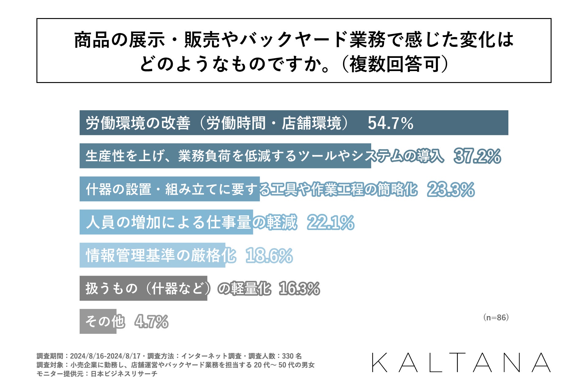 また、前項の設問で「変化があった」と回答された方に「商品の展示・販売やバックヤード業務で感じた変化とはどのようなものか」を尋ねる設問の回答で多かったのは、1位が「労働環境の改善(労働時間・店舗環境)」で54.7%、2位が「生産性を上げ、業務負荷を低減するツールやシステムの導入」で37.2%となりました。この結果から、近年起きている変化とは、働く方の負荷を減らす良い変化が多いとわかりました。