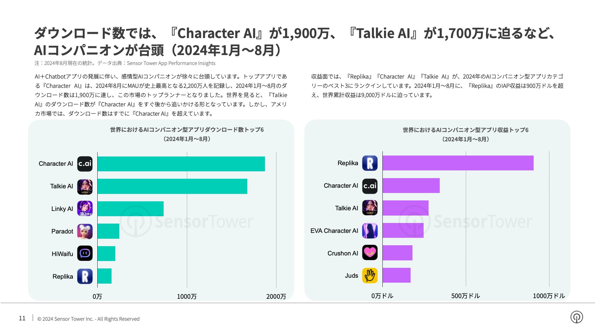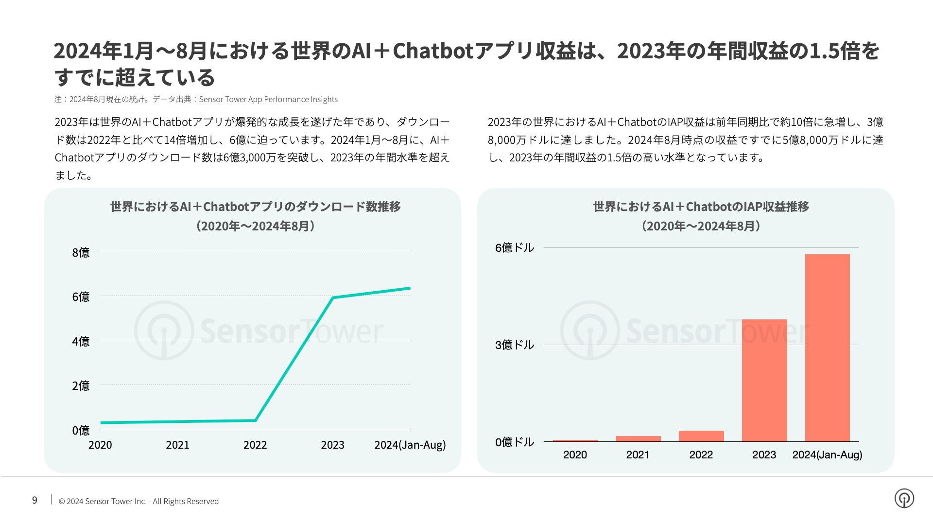 2024年8月時点で、世界のAI+ChatbotアプリのIAP収益は5億8,000万ドルに達しており、すでに2023年の年間収益の1.5倍を超える高い水準となっています。
