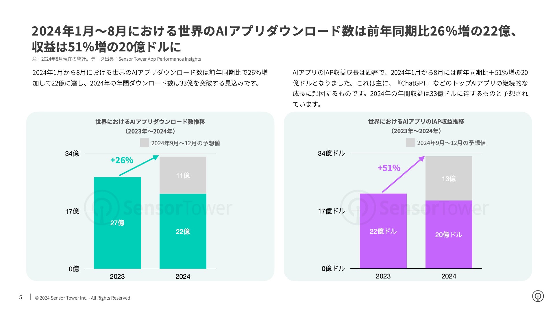 2023年は、世界のAIアプリが爆発的に成長した1年となりました。2024年は、トップAIアプリが力強く牽引したことにより、最初の8ヵ月の総収益が前年同期比+51%と急増し、2024年の年間収益は33億ドルに達する見通しです。