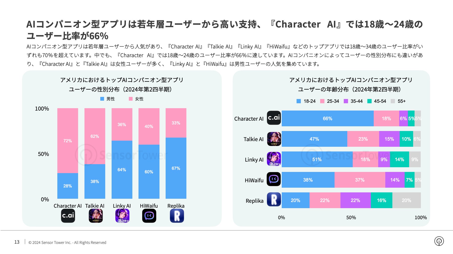 AIコンパニオン型アプリは若年層ユーザーから人気があり、『Character AI』『Talkie AI』『Linky AI』『HiWaifu』などのトップアプリでは18歳~34歳のユーザー比率がいずれも70%を超えています。中でも、『Character AI』では18歳~24歳のユーザー比率が66%に達しています。