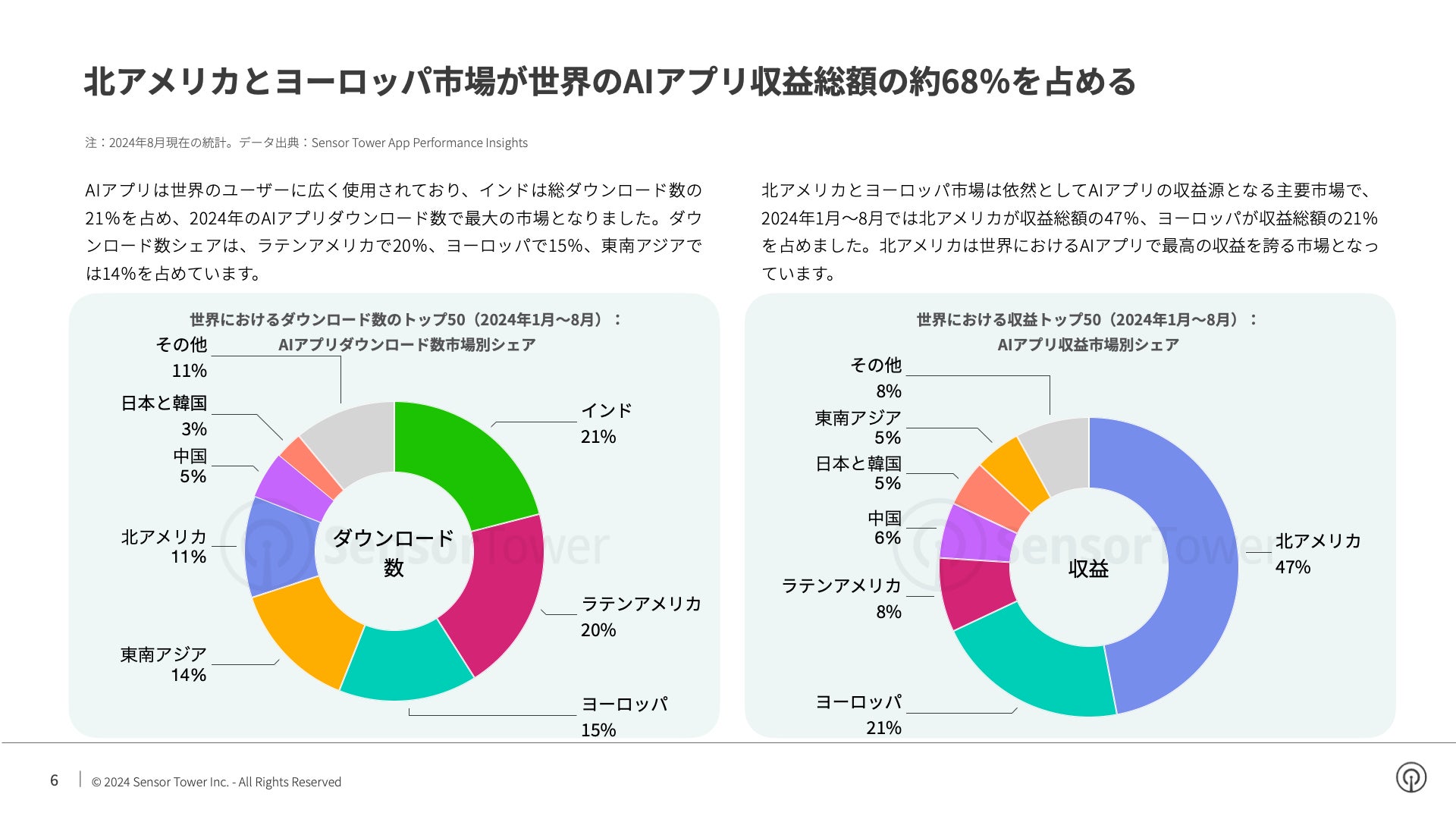 AIアプリは世界各地でダウンロードされて使用されていますが、主な収益源は北アメリカ市場です。ダウンロード数を見ると、インドは2024年AIアプリのダウンロード数が最大の市場で、総ダウンロード数の21%を占めています。北アメリカ市場は世界AIアプリ総収益の47%を占めており、AIアプリで最高の収益を誇る市場となっています。