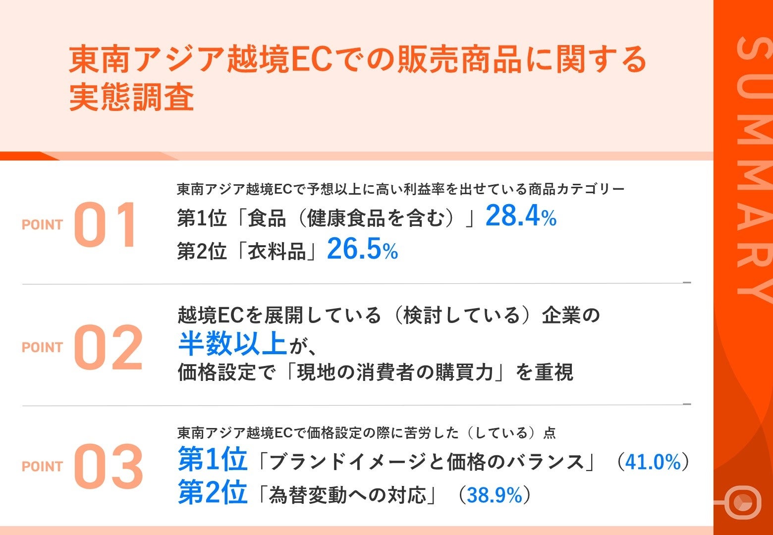 まず、63.9%が東南アジア市場で越境ECを実施/検討していると回答しました。また、東南アジアの越境ECで展開している/展開予定の商品カテゴリーの上位は「衣料品」(32.1%)、「食品」(31.5%)、「家電」(29.9%)であり、その中で予想以上に高い利益率を出している商品カテゴリーにおいても、「食品」(28.4%)「衣料品」(26.5%)「家電」(26.1%)であることがわかりました。次に、日本製品が現地市場で有利と感じる点については、56.8%が「信頼性」、54.6%が「高品質」と回答し、日本製品のブランドイメージや技術力が評価されています。最後に、商品の価格設定では、「現地の消費者の購買力」(50.9%)や「競合他社の価格設定」(41.8%)が重視されており、特に「ブランドイメージと価格のバランス」(41.0%)が価格設定での苦労の一因であることもわかりました。