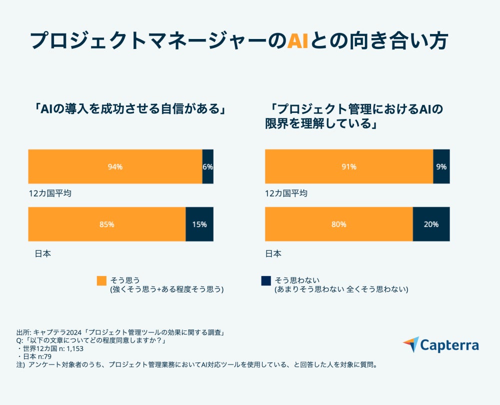 誤りやバイアスのある出力など、AIの「限界を理解している」と答えた日本のPMは80%に上ります。しかし、「限界を理解していない」と回答したのは20%であり、12カ国平均の9%と比較して大幅に高い割合です。さらに、「AIの導入を成功させる自信がある」と述べた日本の回答者は85%と決して低い割合ではないものの、本調査の中では最も低い水準の国となっています。