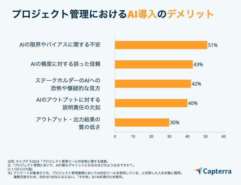 続いて、プロジェクトマネージャーが感じる、プロジェクト管理におけるAI導入のデメリットを見ていきます。