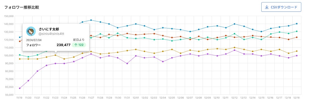 自社アカウントのフォロワー数に変動があった際に、競合分析機能を使って他社のフォロワー推移と比較します。フォロワー数の変動の要因が、Xのプラットフォーム全体で起こっている現象なのか(*1)、自社アカウントの運用による変化なのか要因を確認することができます。さらに、自社アカウントのフォロワー数と、他社アカウントのフォロワー数を相対的に比較することにより、自社アカウントの現状を適切に把握して目標数値を設定することができます。
