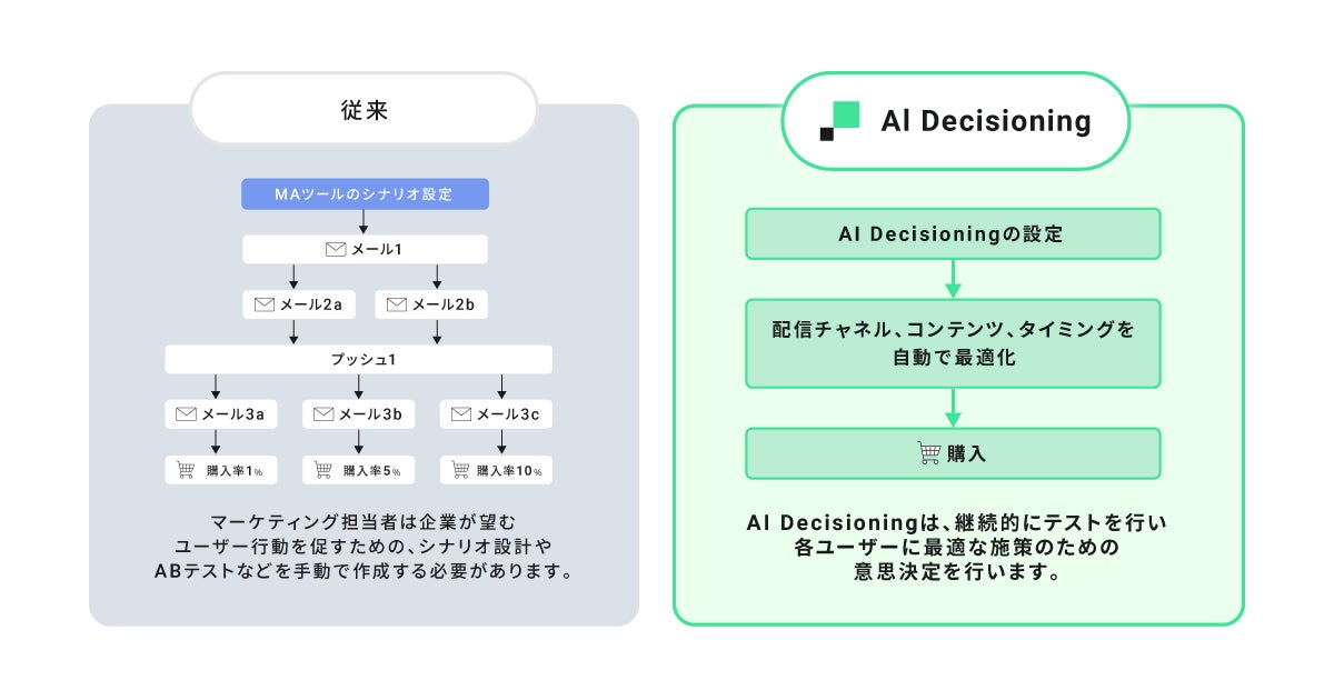 AI Decisioning機能を活用すると、マーケティング担当者が日々行う手動によるセグメンテーション、シナリオ設計、A/B テストの実施など、作業を軽減することができます。