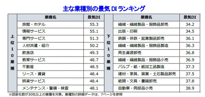 ・「中小企業」(43.9)…同0.3ポイント増。3カ月連続で改善。「インバウンド利用の増加や外国人投資家の買い出し」など、海外からの投資により不動産関連が好調だった。また、人手不足にともなう単価の上昇やIT関連投資などはプラス材料となった。
