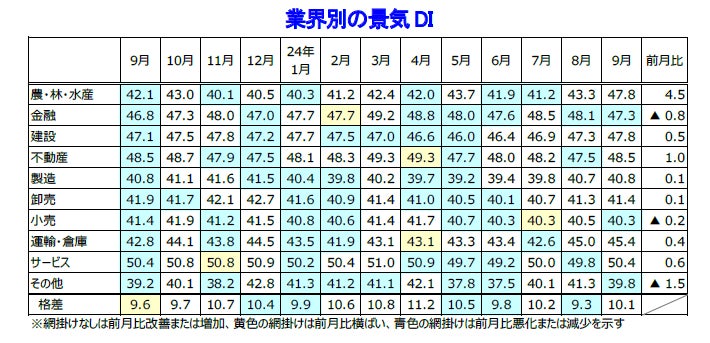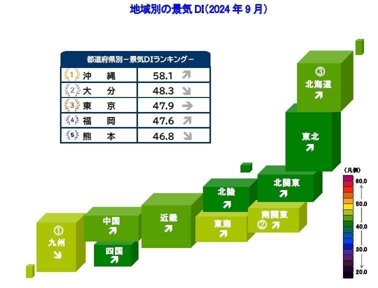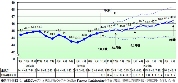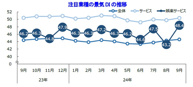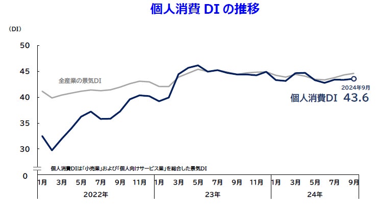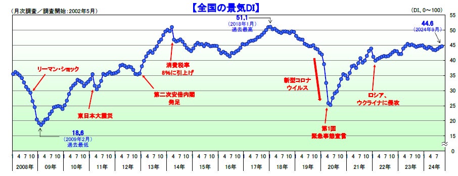2024年9月の景気DIは前月比0.3ポイント増の44.6となり、3カ月連続で改善。国内景気は、インフラ整備の工事拡大や外出機会の増加などで上向き傾向が続いた。