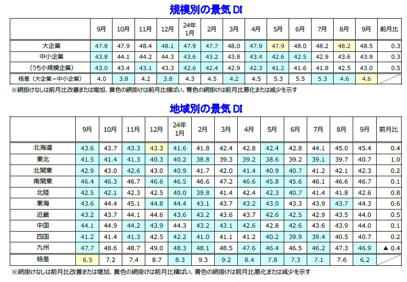 ・『九州』(46.9)…同0.4ポイント減。2カ月ぶりに悪化。域内8県中4県が悪化、4県が改善した。好調なインバウンド消費などで10地域中1位を維持したが、猛暑で来店客が減少した『小売』や燃料高を受けた『運輸・倉庫』が大きく落ち込んだ。