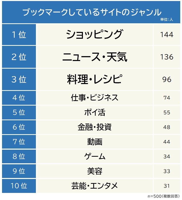 株式会社エムフロ(本社:東京都渋谷区、代表:北脇陽典)は、全国の男女500人を対象に「ブックマーク登録しているサイトに関する意識調査」を実施し、そのデータをランキング化しました。